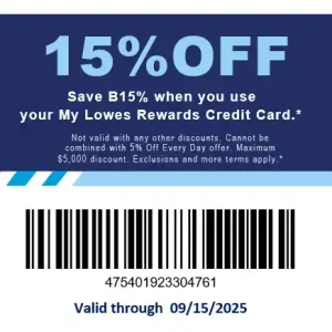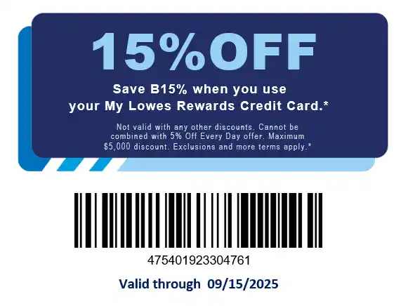 Want a lowes 15 off coupon online that can save more on bigger purchases? This single-use digital coupon provides 15% off eligible merchandise when you pay with a MyLowe’s Rewards™ Credit Card. It works online or in-store, and you receive it instantly as a ready-to-use PDF after checkout.
