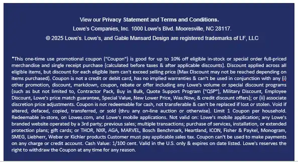 As with all Lowe’s coupons, some restrictions and exclusions apply. For clarity, review the Instructions and Fine Print tabs before checkout.
